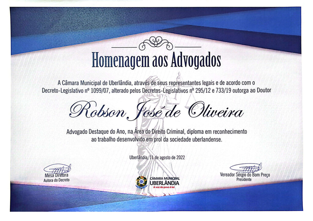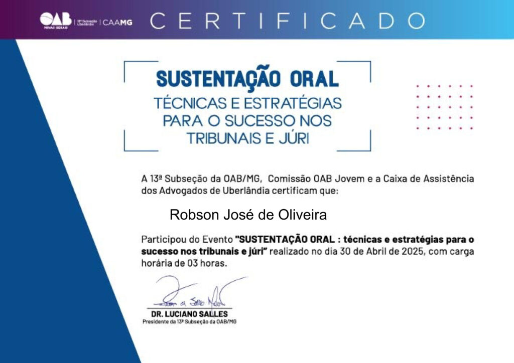 Ao longo dos anos, sempre pautado pela ética e pelo comprometimento com a Justiça, aprofundei minha formação acadêmica com uma Pós-graduação em Direito Processual Civil também pela UFU, concluída em março de 2005.